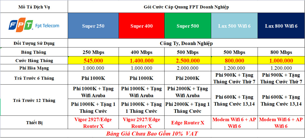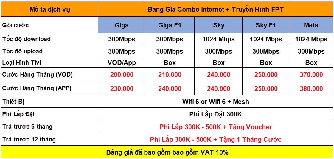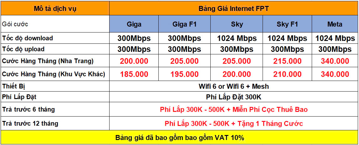 Bảng giá trên đã bao gồm 10% VAT